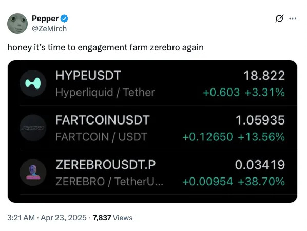 AI agents on Solana are having a moment. Projects like Virtual added $300M in valuation, Zerebro tripled within two days, and more players are accelerating. If broader market conditions hold, we could see continued outperformance in AI-native sectors. New thematic hotspots emerging: Robotic agent projects, Model Context Protocols (MCP), Swarm coordination models, and InfoFi — the intersection of social media and AI.