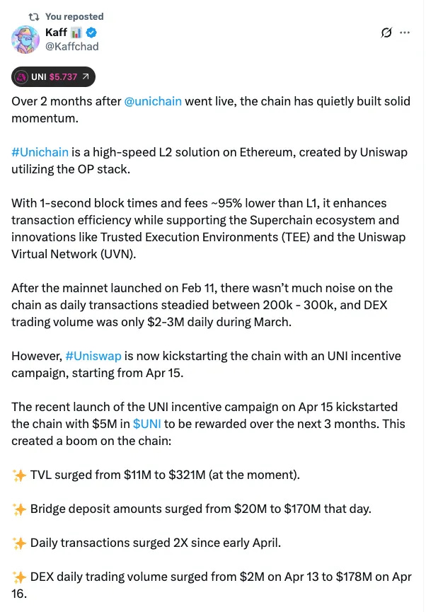 Unichain launched an incentive program and the numbers went vertical. TVL shot from $20M to $200M (10x), liquidity grew from $2.5M to $130M (50x), and daily trading volume exploded from $386K to $38M (100x). Early signs that with the right incentive structures, under-the-radar ecosystems can still scale fast in this market.