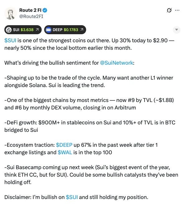 SUI saw a strong breakout, up 30% to $2.90, now overtaking AVAX in global rankings. Rumors of a Pokémon-related collaboration via Parasol Technologies (Mysten Labs) and the upcoming Sui Basecamp event are driving momentum. Behind the scenes, SUI’s DeFi ecosystem is quietly expanding, DEX volume is rising, and new partnerships like the Ledger integration are strengthening fundamentals. The first SUI ETF filing by Canary Funds points to growing institutional curiosity.