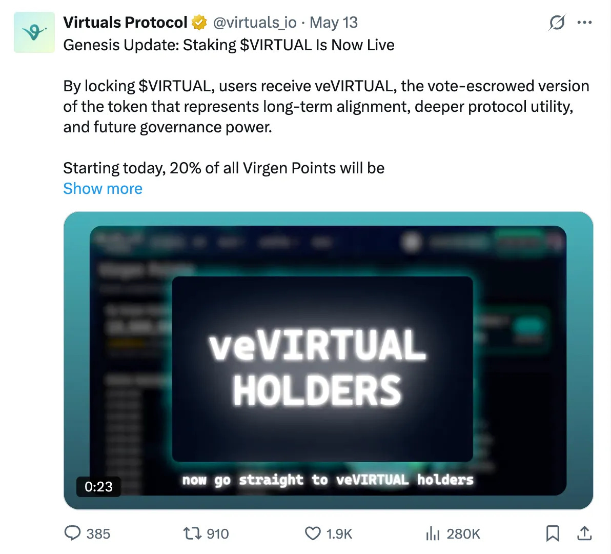 The platform has also recently introduced veVirtual, which can be acquired by staking Virtual. veVirtual holders will earn a share of 20% of total Virgen Points.